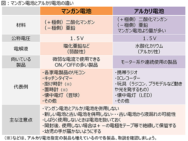 また、取扱説明書にマンガン電池の使用が記載されている製品で、アルカリ電池を使ってしまうと過放電をおこし、液漏れしてしまう可能性がある。