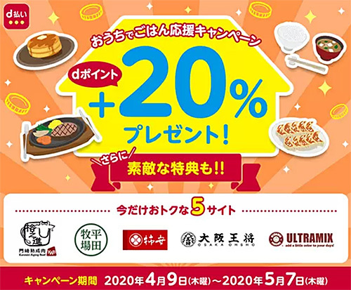 食品通販サイトを対象にした20%還元キャンペーンも実施している。対象のサイトでd払いで支払うと、通常還元率の1%に加え、会計金額の20%相当のdポイントが還元される。