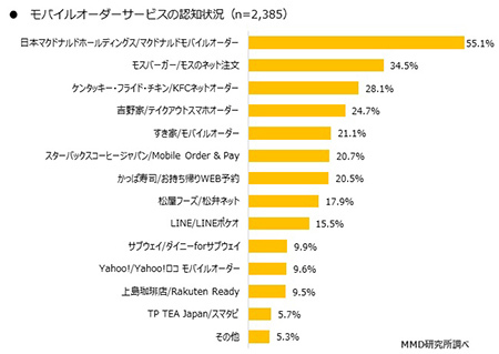 次に、モバイルオーダーのサービス名認知以上の対象者(n=2385)に、知っているサービス名について聞くと(複数回答可)、サービス名の認知は「マクドナルドモバイルオーダー」が55.1%、「モスのネット注文」が34.5%、「KFCネットオーダー」が28.1%という結果になった。