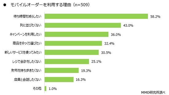 次に、モバイルオーダーを利用する理由を聞いたところ(複数回答可)、「待ち時間を減らしたい」が58.2%、「列に並びたくない」が43.0%、「キャンペーンを利用したい」が36.0%となった。
