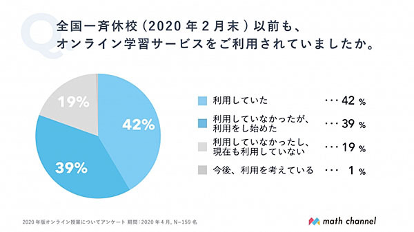 「全国一斉休校(20年2月末)以前も、オンライン学習サービスを利用していたか」という質問に対し、「利用していた」と回答した人が42%、「利用していなかったが、利用をし始めた」と回答した人が39%という結果だった。休校以後に利用し始めた人も多数いることで、オンライン学習サービスを利用する家庭が全体の81%にのぼり、オンライン学習サービスを活用する家庭が急激に増えていることが浮き彫りとなった。