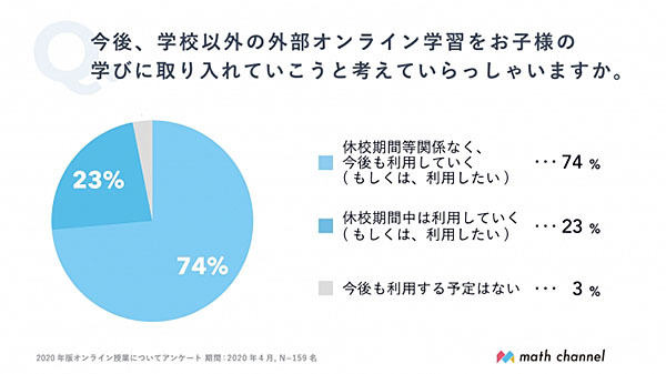 「今後、学校以外の外部オンライン学習を子どもの学びに取り入れていこう(現在利用していない人は、今後取り入れたい)と考えているか」という質問に対して、「休校期間など関係なく今後も利用していく(または、利用したい)」と回答した人は全体の74%と最も高い回答となった。