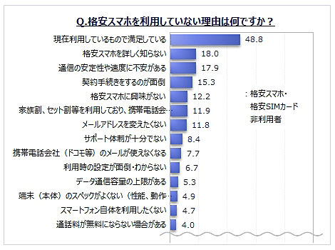 格安スマホを利用していない人(7割強)に、利用していない理由を聞いたところ(複数回答)、「現在利用しているもので満足している」が48.8%、「格安スマホを詳しく知らない」「通信の安定性や速度に不安がある」が各2割弱となった。