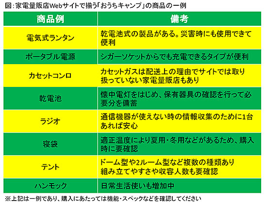 【家電コンサルのお得な話・10】 GW最終日。行楽シーズン真っただ中でも、今年は新型コロナウイルスの影響で外出できずにストレスが溜まっている人も多いだろう。事態の収束に向けて長期化が避けられない状況にあるが、ここでは今年春からテレビや新聞などでよく取り上げられている「おうち(自宅)キャンプ」を紹介したい。筆者がお薦めする理由は、地震や台風など災害時の備えにもなる点だ。