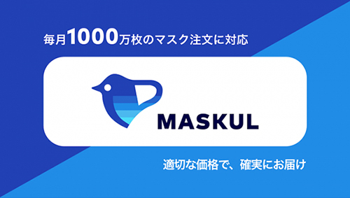 マスクルは、医療法人・食品スーパー・運輸機関・金融機関・官公庁などの法人・団体を始めとして、周りに配りたい個人も購入可能なマスク販売サービス。3層不織布マスク(17.5cm x 9.5cm)を1000万枚/月の注文対応可能な工場直送で、2000枚単位(1枚あたり35円)で提供する。