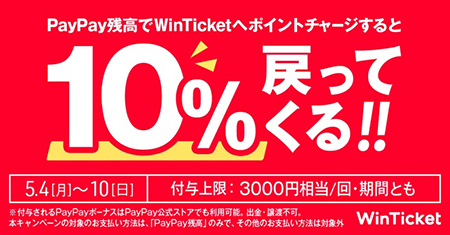 競輪が趣味の人なら、競輪投票サイトとコラボレーションした「WinTicketをPayPayでおトクに楽しもう!キャンペーン」がおすすめだ。PayPay残高でWinTicketのポイントチャージを行うと、10%相当を還元する。還元上限は3000円/回・期間。こちらも5月10日までなので、この週末がチャンスだ。