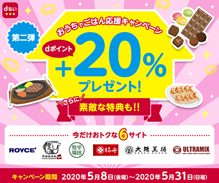 d払いは、食品通販サイトを対象にした20%還元キャンペーンも実施している。対象のサイトでd払いで支払うと、通常還元率の1%に加え、会計金額の20%相当のdポイントが還元される。第1弾は7日に終了したが、8日から第2弾を開始。期間は31日まで。対象の通販サイトは、ROYCE、格之進オンラインストア、平田牧場オンラインショップ、柿安オンラインショップ、大阪王将公式通販、ウルトラミックス本店。第1弾の店舗に、生チョコレートが有名なROYCEが追加された。還元だけでなく、サイトごとに異なる特典がついてくるのもうれしい。