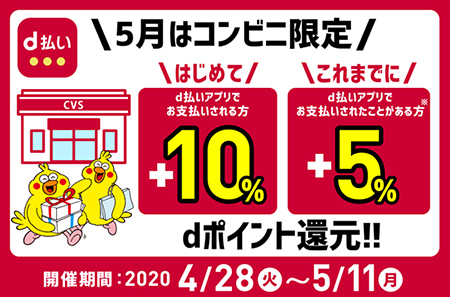 デリバリーや配達に絞ったものではないが、全国の対象コンビニエンスストアでd払いを利用すると、通常の還元ポイントに加え、最大10%相当をポイントを還元する「d払いでコンビニ最大+10%還元キャンペーン」も開催中だ。4月27日以降に初めて利用する場合、税込支払額の10%、利用経験がある場合は5%をキャンペーンポイントとして還元する。