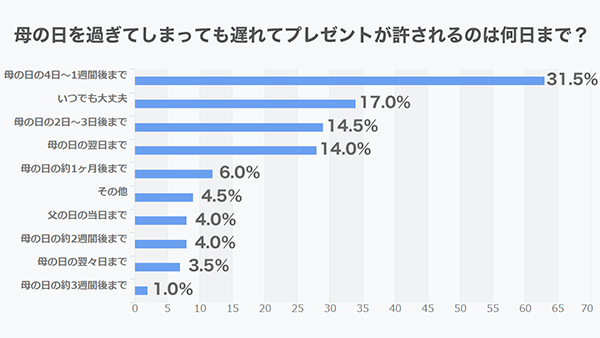 昨日の5月10日の「母の日」にプレゼントを渡しそびれたという人も少なくないだろう。母の日の情報ポータルサイト「母の日.me」が「プレゼントを渡すことが許されるのは何日まで」という調査をしたところ、「母の日の4日~1週間後まで」が1位で31.5%、「いつでも大丈夫」が2位で17.0%、「母の日の2日~3日後まで」が3位で14.5%という結果になった。