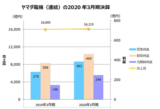 ヤマダ電機が5月7日に発表した2020年3月期連結決算は、売上高が1兆6115億3800万円(前年度比0.7%増)、営業利益が383億2600万円(37.5%増)、経常利益が460億7400万円(24.9%増)、親株会社に帰属する当期純利益が246億500万円(67.5%増)の大幅な増益となった。
