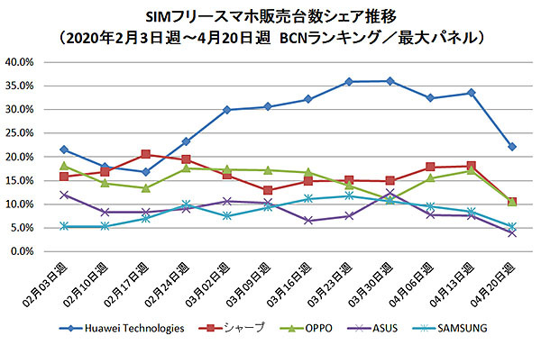 週次の販売数量シェア推移では、3月から4月前半にかけて30%を超えるシェアを維持していたファーウェイが沈んだ。2位以下は相変わらず接戦だが、サムスンがASUSを上回る比率が高くなってきている。