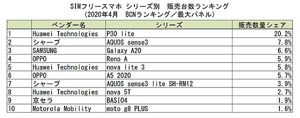 シリーズ別では「HUAWEI P30 lite」が2カ月連続で首位。シェアは20.2%で2位以下を大きく引き離した。2月発売の京セラ「BASIO4」やモトローラ・モビリティ「moto g8 plus」がランクインしている点にも注目したい。