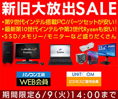 パソコン工房・グッドウィルを運営するユニットコムは、パソコン工房ウェブサイトで5月12日から6月9日14時までの期間限定で「新旧大放出セール」を開催する。
