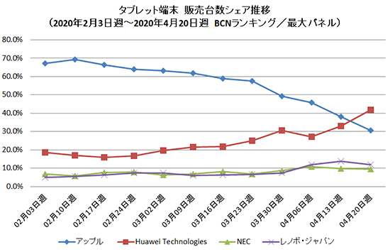 週次で販売台数シェアを追いかけると、2月前半では7割のシェアを誇っていたが、徐々に下降。入れ替わるようにAndroid勢が上昇に転じ、4月20日週にはついにファーウェイがアップルを逆転した。