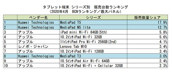 シリーズ別の販売台数ランキングもそれを裏付けるように、iPadが不動のトップから陥落。ファーウェイの「MediaPad T5」と「MediaPad M5 lite」がワンツーフィニッシュを果たしている。iPadの中でも順位変動は起きており、売れ筋の「10.2インチ iPad Wi-Fi(32GB)」が4位に後退。「iPad mini Wi-Fi(64GB)」が3位に上昇している。(BCN・大蔵 大輔)