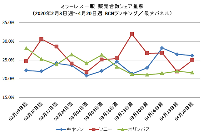 メーカー別の販売台数前年比でも勝ち馬はおらず、キヤノン(20.4%)、ソニー(24.5%)、オリンパス(25.8%)といずれも大きく減少。当分は遠出やレジャーの自粛継続すると予想されるため、市場回復時期を占うのも難しい状況だ。