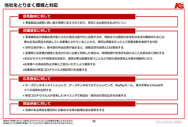 もちろん、営業の継続については、従業員や顧客の健康と安全のために必要は感染症防止対策を積極的にとることはいうまでもない。ケーズHDでは、マスクや消毒液の支給、顧客への感染防止対策の協力を要請するほか、従業員向けの相談窓口なども設置するという。