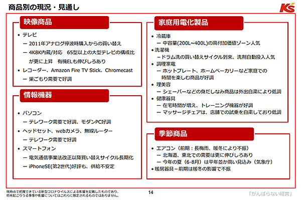 さらに具体的な商品別の見通しを示しているのもヒントになる。例えば、レコーダー、Amazon Fire TV Stick、Chromecastなどは巣ごもり需要で好調だし、テレワーク需要で高性能の軽量なノートPC、ヘッドセット、ウェブカメラ、Wi-Fiルータなども好調だという。一方で、スマートフォンは買い替えサイクルの長期化や供給の不安定などの不安要因があると読む。