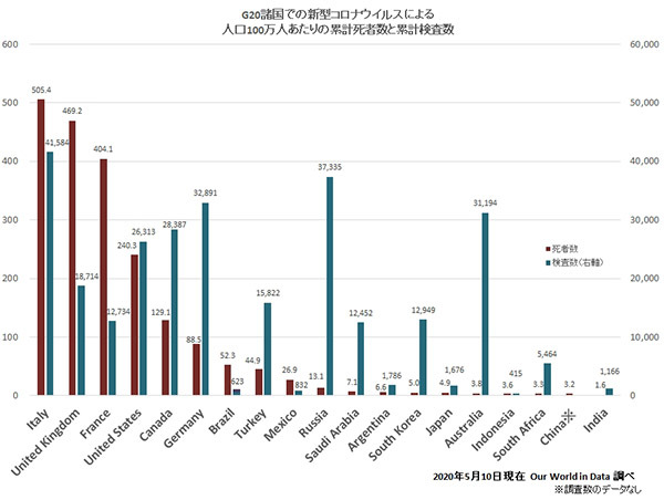 Our World in Dataのデータをもとに、EUを除くG20の19カ国で、人口100万人あたりの累計検査数と死者数を比較した。事実として、日本の検査数はとても少ない。5月10日時点までの累計で、100万人あたり1676人。14番目の少なさだ。検査数4万1584人でトップのイタリアと比べると25分の1、2万6313人のアメリカの16分の1、3万7335人のロシアの22分の1しか実施できていない。