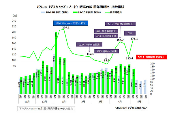 とはいえ、昨年の10連休に対して、今年の全国で外出自粛が要請された環境下での二桁増は、PC需要の高さを示している。