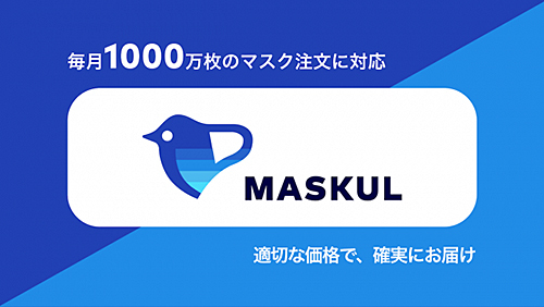 マスクルは、医療法人・食品スーパー・運輸機関・金融機関・官公庁などの法人・団体を始めとして、周りに配りたい個人も購入可能なマスク販売サービス。3層不織布マスク(17.5cm x 9.5cm)を1000万枚/月の注文対応可能な工場直送で、2000枚単位で提供する。