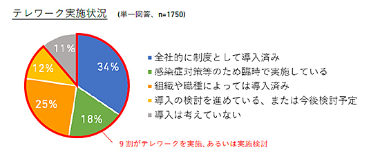 VAIOが実施した独自調査によると、約9割の企業がテレワークを実施もしくは実施を検討している一方で、全社に導入済みの企業は約3割に過ぎないことが分かったという。政府が掲げる「オフィス出勤者の最低7割削減」の目標とは乖離が生じている。