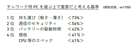 また、テレワーク用PCを選ぶ基準として、価格以上に軽さや薄さなど持ち運びやすさ、セキュリティ、バッテリの駆動時間などを重視していることが分かった。目先の在宅勤務だけでなく、長期的なニーズも踏まえてフレキシブルに勤務できる機能や性能に高い関心を寄せているという。