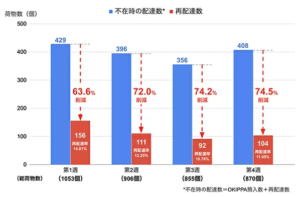 アンケート調査によれば、OKIPPAによって平均で7割以上の再配達が削減された。再配達となってしまった割合は、期間全体で平均12.57%で、国土交通省の調査による全国平均の16%を大きく下回っている。また、週を追うごとにOKIPPAの活用率が向上し、再配達率が低下した。