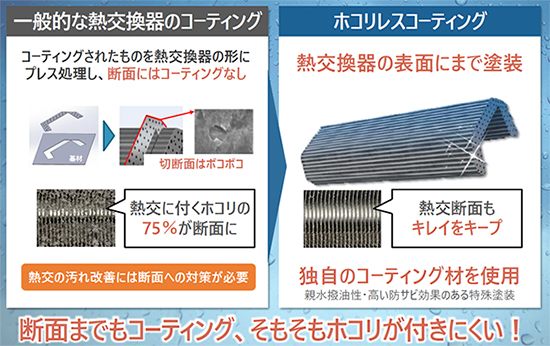 パナソニックの「Eolia(エオリア) Xシリーズ」は、熱交換器の細かいフィンの断面まで独自のコーティング材を塗装することで、少しの水で油が付着せずに流れ落ちる「ホコリレスコーティング」を施している。熱交換器に付着するホコリの75%が断面に付着する中で、キレイさをキープすることができる。