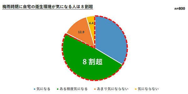 調査によると、梅雨時期の自宅の衛生環境が気になっていると答えた人は、「気になる」(33.6%)と「ある程度気になる」(49.1%)を合わせて8割超に上ることが分かった。