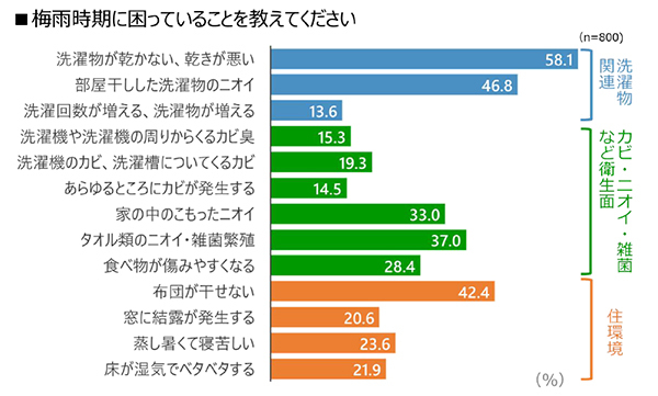 具体的な困りごとについては、「洗濯物が乾かない、乾きが悪い」(58.1%)と「部屋干しした洗濯物のニオイ」(46.8%)など、洗濯物に関することが多い。また、「タオル類のニオイ・雑菌繁殖」(37.0%)や「家の中のこもったニオイ」(33.0%)など、ニオイやカビ、雑菌など衛生面に関する項目が多かった。