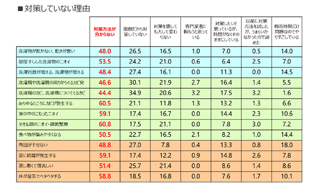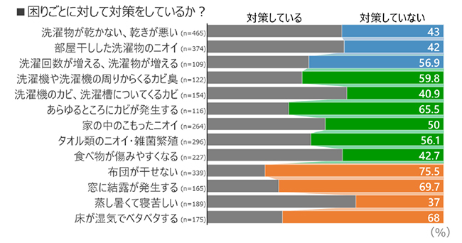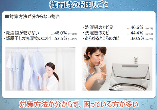 対策方法が分からないなかで大きな割合を占めていたのが、「洗濯物が乾かない」(48.0%)や「部屋干しの洗濯物のニオイ」(53.5%)「洗濯機のカビ臭」(44.6%)「洗濯機のカビ」(44.4%)「あらゆるところのカビ」(60.5%)など、洗濯物や洗濯機に関することが多かった。
