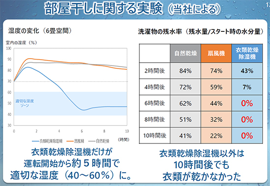 そこでパナソニックは、洗濯物を乾かすには「湿気をとる」ことと「風をあてる」ことがポイントで、衣類乾燥除湿機の使用をアドバイスした。実際に自然乾燥と扇風機、衣類乾燥除湿機を使った洗濯物を乾かす実験(梅雨を想定した室温20℃、湿度70%)では、衣類乾燥除湿機は6時間後にほぼ乾燥させることができた。