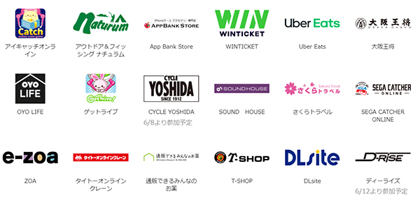 今回、公開された対象店舗は、アイキャッチオンライン、アウトドア&フィッシング ナチュラム、App Bank Store、WINTICKET、Uber Eats、大阪王将、OYO LIFE、ゲットライブ、CYCLE YOSHIDA(6月8日より参加予定)、SOUND HOUSE、さくらトラベル、SEGA CATCHER ONLINE、ZOA、タイトーオンラインクレーン、通販できるみんなのお薬、T-SHOP、DLsite、ディーライズ(6月12日に参加予定)、出前館、ドスパラ、とるモ、ニコニコポイント、BTOパソコンのサイコム、FABRIC TOKYO、BOOK WALKER(6月19日より参加予定)、Flier、PREMOA、モバクレ、mobage、ヤマダウェブコム、(6月1日11時より参加予定)、ヤマダモール(6月19日より参加予定)、ロイヤルオンラインショッピング(6月19日より参加予定)、LOCONDO、6月19日より参加予定)。対象ストアは今後も増えていく予定だという。