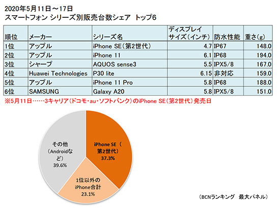 サイズは「iPhone 8」そのまま、「iPhone SE」の名称を引き継いだ「iPhone SE(第2世代)」は、最も買い求めやすい価格のiPhone。当初の4月27日から延期されたキャリア版発売日の5月11日を含む5月2週(2020年5月11~17日)、家電量販店の実売データを集計した「BCNランキング」で、iPhone SE(第2世代)はシェア37.3%を占め、前評判を裏切らない好調な滑り出しを切った。4.7インチのサイズ感と「Touch ID(ホームボタン)」は、使い慣れたインターフェースを求める層に引き続き好感触のようだ。