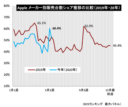 2週間の延期の末、発売になったとはいえ、全国のキャリアショップは営業時間を短縮。全館休業のショッピングモール・商業ビル内の店舗は臨時休業していた。営業中の店舗も予約者優先のため、予約なしにフラッと買いたい層には、家電量販店が最適だった。こうした今年特有の事情も、シェアを押し上げたと思われる。