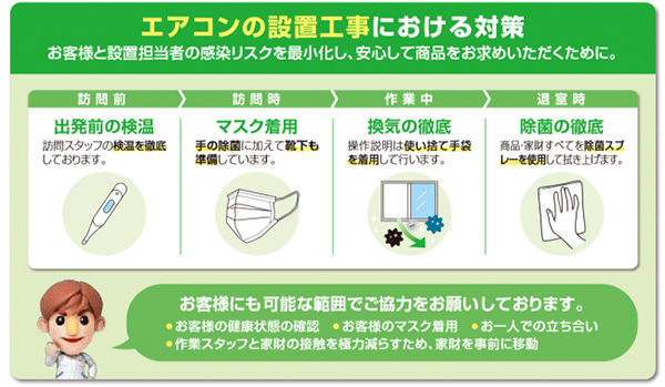 具体的には、新型コロナウイルスの感染拡大防止の観点から、「出発前に訪問スタッフの検温を徹底」「訪問スタッフはマスクを着用して訪問・作業する」「作業前に手を消毒し、上履き用靴下を着用する」「設置作業中は窓を開け、換気を行いながら取付工事を行う」「商品や設置した部屋の床などを、除菌スプレーで拭きあげてから退室する」などの対応を実施する。