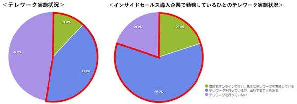 まず、テレワークの実施状況について聞いたところ、47.2%が、コロナウイルス感染拡大後もテレワークを行っていないと回答した。インサイドセールス導入企業で勤務している人の場合は、80%がテレワークを実施していると回答していた。
