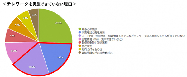 テレワークを実施できない理由については、PCや電話環境に加え、情報共有を行うためのツールなど、環境整備に対する課題が約40%にのぼった。