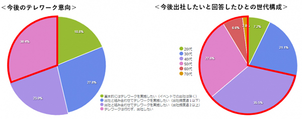 今後のテレワーク意向に関しては、「今後テレワークを実施したい(出社と組み合わせて実施したいを含む)」と回答した人が69.6%となり、今後もテレワークを働き方の選択肢として取り入れたいという意向が高いことがうかがえた。また、「今後テレワークは行わず出社したい」と回答した人のうち、71.7%は40代以上が占める結果となった。