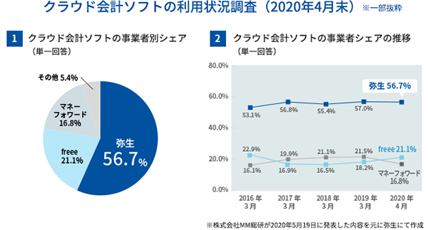 弥生は、MM総研が5月19日に発表した「クラウド会計ソフトの利用状況調査(2020年4月末)」で個人事業主のクラウド会計ソフト市場でシェアNo.1を獲得した。利用状況調査でのシェアNo.1獲得は、5年連続となる。