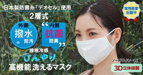 新製品は、マスク熱中症予防に向けた快適フィットの夏用ひんやりマスク。内側と外側に、それぞれ異なる機能を付与した2層式となっており、外側は飛沫による汚れの付着を防ぐ撥水加工を施している。内側は、日本製抗菌糸デオセルを採用した快適な接触冷感生地で、マスクを清潔に保つとともに防臭効果も実現した。