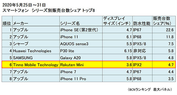 家電量販店の実売データを集計した「BCNランキング」によると、Rakuten Miniは、キャンペーン開始直前の5月3週(2020年5月18~24日)のシェアがわずか0.2%で、キャリア・容量・カラーを合算したシリーズ別集計で45位と低迷していた。しかし、キャンペーンが始まった5月4週(20年5月25~31日)はシェアが4.7%まで拡大し、6位に食い込んだ。
