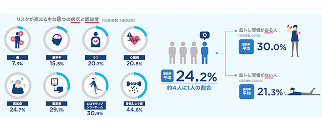 また、普段から筋トレの習慣がある人とない人で比較すると、筋トレ習慣がある人の認知率の平均が30%なのに対して、筋トレ習慣がない人が平均で21.3%と大きな開きがあることもわかった。このままこれらの健康リスクに対し、正しい理解がされないと、「重大疾患予備軍」、ひいては「発症者」が増えることも予想される。