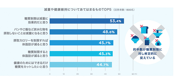 ダイエットについても尋ねたところ、 「糖質制限は減量に効果的だと思う」と回答した人が53.4%、「糖質制限すると体脂肪が減ると思う」と回答した人が45.3%と、約半数の人が「糖質制限」がダイエットに有効だと回答。また、「健康のためにはできるだけ糖質をカットしたいと思う」と答えた人は44.7%にものぼり、多くの人が「糖質は悪」と否定的に捉えている実態が明らかになった。
