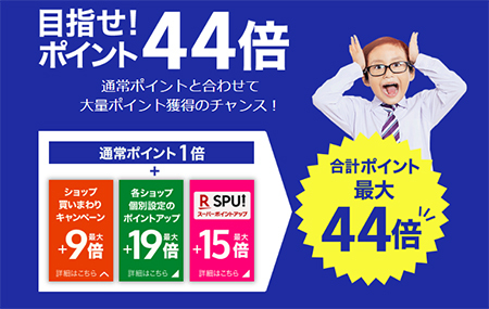 最大44倍のポイント獲得のチャンスもある。通常ポイント1倍のほか、1000円以上の商品を複数店で買いまわるほど倍率が最大9倍までアップする「ショップ買いまわりキャンペーン」や各ショップの個別設定のポイントアップ(最大19倍)、スーパーポイントアップ(最大15倍)などを重ねていくと最大44倍までアップする仕組みだ。