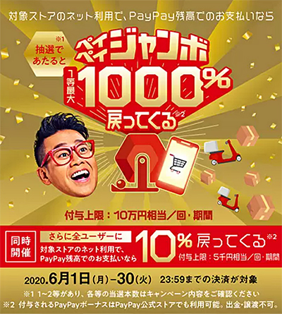 PayPayは定例の月替わりキャンペーンとして、6月1日から対象のオンラインストアでPayPay残高から決済すると抽選で決済金額の最大10倍が戻ってくる「ペイペイジャンボ(オンライン)」、10%還元キャンペーン(還元上限は5000円相当/回・期間)を開催している。