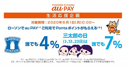 au PAYは6月1日からローソンで、Pontaカード提示・au Pay決済で最大11%を還元するキャンペーンを開催。auユーザーとそれ以外で還元率に違いはあるが、3日・13日・23日の「三太郎の日」が特にお得になる。