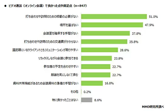 ビデオ通話(オンライン会議)の良かった点や満足点は(複数回答)、「打ち合わせや訪問のための移動の必要がない」(51.0%)を挙げる人がもっとも多く、「場所を選ばない」(47.9%)、「会議室を確保する手間がない」(37.8%)がそれに続いている。