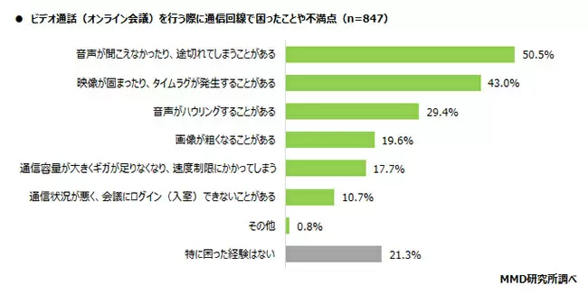 ビデオ通話(オンライン会議)を行う際の、通信回線に関する困ったことや不満点は(複数回答)、「音声が聞こえなかったり、途切れてしまうことがある」(50.5%)が最多で、「映像が固まったり、タイムラグが発生することがある」(43.0%)が2位、「音声がハウリングすることがある」(29.4%)が3位にランクインした。